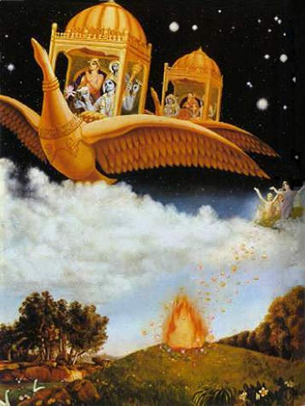 «Когда наступило утро, Рама, взяв небесный корабль, приготовился взлететь. Тот корабль был большим и прекрасно украшенным, двухэтажным, со многими комнатами и окнами. Корабль издал мелодичный звук перед тем, как взмыть в заоблачные выси».